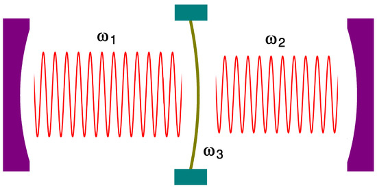 In particular, coupled oscillator model for nano-optomechanical systems is important because many novel state-of-the-art techniques can be realized by utilizing it. For instance, couplings of photonic systems with mechanical resonators provide fundamental platform for quantum technologies, such as slow/fast-light generation [13], cooling of nanomechanical resonators [14,15], frequency conversion [16,17], and phononic-structure preparation [18]. You can see an example of nano-optomechanical three coupled oscillators from Figure 1.