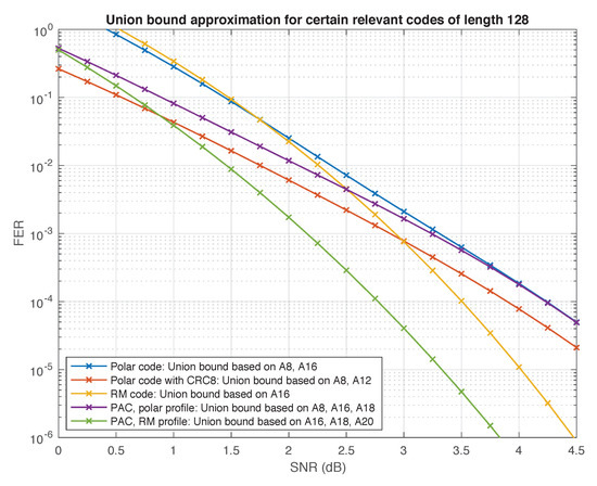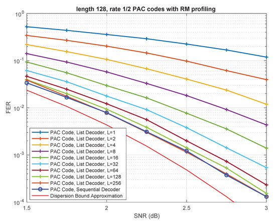 Finally, we also include in Figure 1 and Figure 3 the BIAWGN dispersion-bound approximation for binary codes of rate and length 128. The specific curve plotted in Figure 1 and Figure 3 is the so-called saddlepoint approximation [51] of the meta-converse dispersion bound of Polyanskiy, Poor, and Verdu [3]. Our curve coincides with those given in Figure 1 of [52] and Figure 6 of [53]. Note that a more accurate bound can be derived using the methods of Erseghe [9], but this is not critical for our purposes. It is clear from Figure 1 and Figure 3 that the performance of the (128,64) PAC code, under both sequential decoding and list decoding with , is close to the best achievable performance.