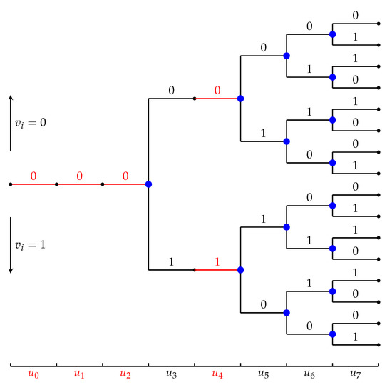 The polar search tree, shown schematically in Figure 4, represents all possible inputs to the polar encoder. It is an irregular tree with levels containing paths. If then all nodes at level i have a single outgoing edge, as is dynamically frozen in this case. In contrast with conventional polar codes, these edges may be labeled differently (cf. in Figure 4). If then all nodes at level i have two outgoing edges. In this framework, both list decoding and sequential decoding can be regarded as tree-search algorithms that try to identify the most likely path in the tree. The list decoder does so by following L paths in the tree, from the root to the leaves, and selecting the most likely one at the end. The Fano sequential decoder follows only one path, but has many back-and-forth movements during the decoding process.