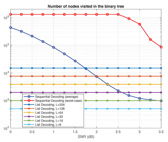 For the sake of qualitative comparison, we take the total number of nodes the two algorithms visit in the tree as one reasonable proxy of their complexity. In doing so, we disregard the nodes at the frozen levels, counting only those nodes that have two outgoing edges (colored blue in Figure 4); we call them the decision nodes. Figure 5 shows the number of decision nodes visited by the two decoding algorithms as a function of SNR.