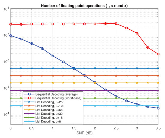 As another qualitative metric of complexity of the two algorithms, we count the total number of additions, comparisons, and multiplications of floating-point numbers throughout the decoding process. The results of this comparison are compiled in Figure 6. The number of floating-point operations is a more precise measure of complexity than the number of decision nodes visited in the search tree. Yet we observe exactly the same pattern as in Figure 5. For list decoding, it is no longer possible to give a simple expression as in (8), but the complexity is still independent of SNR, resulting in flat curves. For sequential decoding, we again observe the same two phenomena discussed earlier in connection with Figure 5. In particular, the worst-case complexity remains prohibitive even at high SNRs.