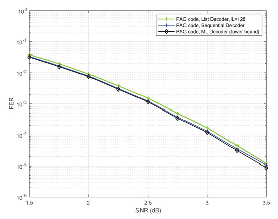 It has been observed in several papers that for polar codes, list decoding rapidly approaches the performance of ML decoding with increasing list-size L. In this section, as expected, we find this to be the case for Arıkan’s (128,64) PAC code as well.