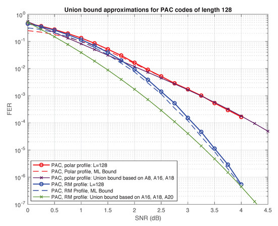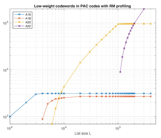 Another objective of this paper is to provide some insights into the remarkable performance of PAC codes observed in simulations. Although theoretical analysis of list decoding remains an open problem even for conventional polar codes, it has been observed in numerous studies that list decoding quickly approaches the performance of maximum-likelihood decoding with increasing list size L. As expected, we find this to be the case for PAC codes as well (see Figure 7). Fortunately, maximum-likelihood decoding of linear codes is reasonably well understood: its performance is governed by their weight distribution, and can be well approximated by the union bound, especially at high SNRs. Motivated by this observation, we use the method of [5] to estimate the number of low-weight codewords in PAC codes, under polar and RM rate profiles (introduced by Arıkan [2]). We find that PAC codes with the RM rate-profile are superior to both polar codes (with or without CRC precoding) and the (128,64,16) Reed–Muller code. For more on this, see Table 3 and Figure 9 and Figure 10. We also introduce and study random time-varying convolutional precoding for PAC codes. We find that, as compared with the convolutional precoding introduced in [2], time-varying convolutional precoding is much less sensitive to the constraint length. Arıkan uses in [2] a convolutional code generated by , whose constraint length is . In Figure 12, we observe that under list decoding, random time-varying precoding achieves essentially the same performance with constraint length .