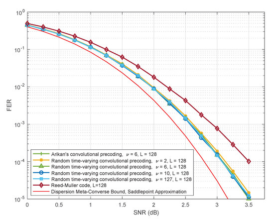 Figure 11 summarizes our simulation results for the case where the constraint length is fixed at while the list size ranges through . We can see from this figure that the performance of PAC codes under random time-varying convolutional precoding coincides with the list-decoding performance of the benchmark for all the relevant list sizes.