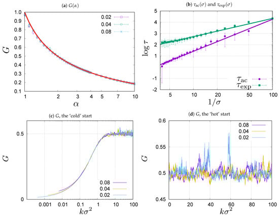 Once the stationary state is reached, the value of the Gini coefficient fluctuates about the steady state value. This is illustrated in Figure 1d where we show evolution of the Gini coefficient in systems initiated from hot starts, that correspond to the stationary wealth distribution given by Equation (4). The Gini coefficient fluctuates about the stationary value but the way it fluctuates about this value slightly depends on the volatility . The reason for this is related to the presence of a heavy tail in the limiting distribution (4), which for , leads to an infinite variance. In effect, the curves representing the evolution in Figure 1d exhibit strong fluctuations which depart from mean value. For the simulations shown in the figure, the length of evolution measured in the discrete time steps, k, is sixteen and four times longer for and , respectively, than for . Therefore, we observe more fluctuations and larger deviations for and than for . To quantify the degree of correlation between the values of the Gini coefficient at different times, we measure the integrated auto-correlation time [43] which gives a typical timescale for the length of temporal fluctuations. Coming back to Figure 1b we show there the dependence of the integrated auto-correlation time on for the system with and . It can be compared in the figure to the relaxation time that we previously discussed. As you can see, both and grow when decreases. The straight lines in Figure 1b are to guide the eye. They are determined as the best power-law fits: , where and , where .