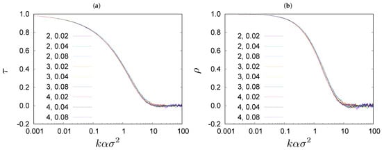 Wealth rank is a position on the ranking list ordered from the richest to the poorest individuals. The wealth ranking is continuously reshuffling, even in the stationary state. The rate of reshuffling depends on and j: the larger and j the faster is the reshuffling. Changes in wealth ranking are faster when is larger. In Figure 2, we show rank correlations between wealth ranking lists obtained in the Monte Carlo simulations of the Bouchaud–Mézard model [24], for configurations separated by k steps of evolution (7), in the stationary state of the system with , and , and , and , and . The degree of rank correlations is quantified by Kendall’s [40] and Spearman’s [41] (see Appendix A). In Figure 2, we plot and against a rescaled variable . We can see that the curves lie on top of each other, reflecting some universality of the wealth rheology in the model (1).