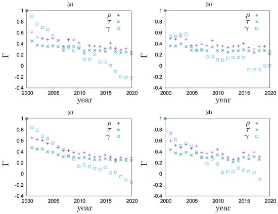 Time evolution of various rank correlations for top 100 richest people in (a) Poland, data from [11], (b) Germany, data from [12], (c) the USA, data from [13] and (d) the world, data from [13].