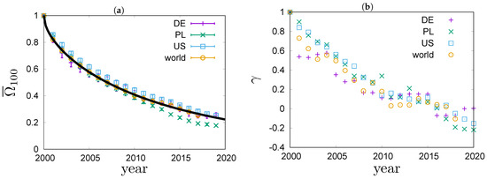 In Figure 5a, values of the overlap ratio of the annual top 100 richest lists in Poland, Germany, the US and the world are compared. The overlap ratios exhibit a fairly universal behaviour that is well described by the phenomenological Formula (12). The best fit to the top 100 richest people in the world is shown with a solid line in Figure 5a. It fits the data very well. We can see that in the four systems the overlap ratio drops to after years. In Figure 5b, values of the Goodman–Kruskal’s rank correlation coefficient for the four systems are compared. We can see that the rank correlations fall off from one to zero roughly within 20 years. The rate of decay for is quite similar in all the studied systems. For Germany, the dependence of on time exhibits an interesting pattern. The values of stay roughly constant for a couple of years, then significantly drop and again stay roughly constant for a couple of years. This motif repeats a couple of times, forming a stairway shape.