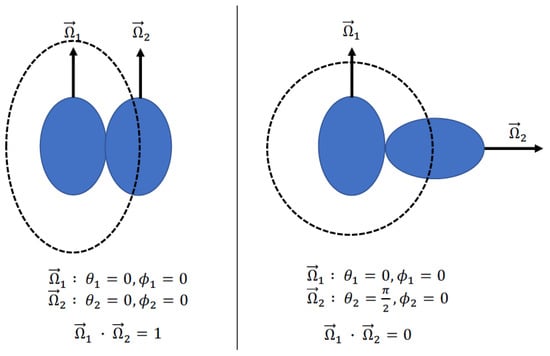 Examples of relative orientations of prolate spheroids and how this maps to the dot product of the spheroids directional unit vectors. The example on the left is for two aligned spheroids. When the spheroid directional unit vectors both point in the same direction, then the dot product is unity, and this relative orientation leads to the lowest excluded volume state. The example on the right is when directional vectors are orthogonal, and this leads to the highest excluded volume state. The dashed lines represent the excluded volume around particle 1 due to particle 2 when they are in a particular relative orientation.