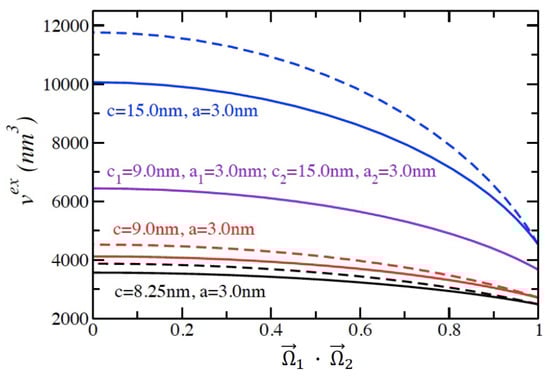 As mentioned previously, one widely used method of determining the excluded volume of two prolate spheroids of the same size in any orientation is to use the Gaussian overlap model []. The expression for the excluded volume of two spheroids that follows from this model is