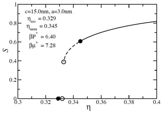 A comparison of the two excluded volume calculation methods for pure component liquid crystal systems is shown in Table 1. Two sizes of prolate spheroids (c = 8.25 nm, a = 3.0 nm, and c/a = 2.75; c = 9.0 nm, a = 3.0 nm, and c/a = 3) were chosen to directly for comparison to the simulation data []. For our numerical calculation, we used an evenly spaced discretization of 100 values for the polar angle and 50 evenly spaced values for the discretization of the azimuthal angle. When using the Gaussian overlap method, our results agree exactly with those in Reference [] and agree extremely well with the simulation results when dividing by eight (z = 4) in the resummation term. When the rigorous excluded volume is used instead of the Gaussian overlap excluded volume method, the results are no longer in agreement with the simulation results. The lower excluded volume shifts the phase boundary to higher values of the volume fraction, and as a result, there is an increase in the pressure and chemical potential of the phase boundary for both sizes of the prolate spheroid. However, if we divide the resummation term by six (z = 3), the rigorous excluded volume method results are in very good agreement with the simulation values. We therefore conclude that, using the correction (z = 3), the resummation term should be used whenever accurate values of the excluded volume are used. Figure 3 illustrates the phase equilibrium result for a pure prolate spheroid system with a size of c = 15 nm and a = 3 nm, in which z = 3. S is the second Legendre polynomial order parameter, as discussed earlier. The solid lines are the equilibrium values, while the dashed lines correspond to the metastable nematic phase. As demonstrated in Table 1, the isotropic–nematic transition occurs at a lower value of the packing fraction due to the larger excluded volume.