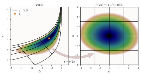 Non-linear posterior distribution in the standard coordinate system of the prior distribution (left) and the transformed distribution (right) in the coordinate system y where the posterior metric becomes (approximately) the identity matrix. is obtained from via the push-forward through the transformation g which relates the two coordinate systems. The functional form of g is derived in Section 2.1 and depends on an expansion point (orange dot in the left image), and g is set up such that coincides with the origin in y. To visualize the transformation, the coordinate lines of y (black mesh grid on the right) are transformed back into -coordinates using the inverse coordinate transformation and are displayed as a black mesh in the original space on the left. In addition, note that while the transformed posterior arguably takes a simpler form compared to , it does not become trivial (e.g., identical to a standard distribution) as there remain small asymmetries in the posterior density. There are multiple reasons for these deviations which are discussed in more detail in Section 2.2 once we established how the transformation g is constructed.