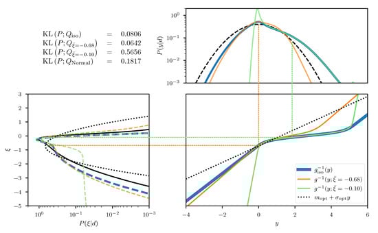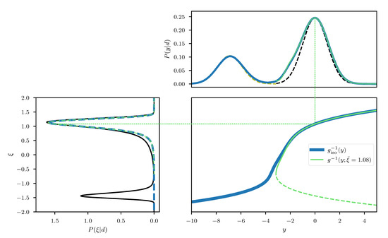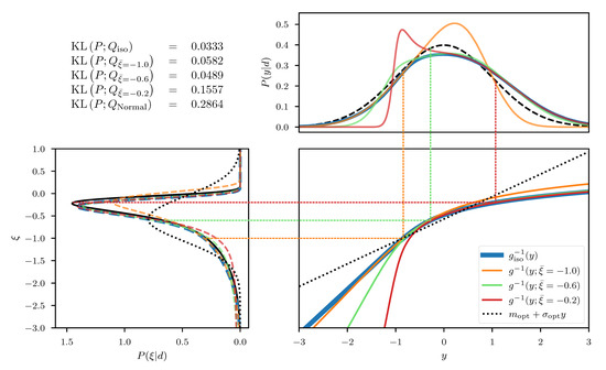 Illustration of the coordinate transformation for the one-dimensional log-normal model (Equation (54)). The true posterior , displayed as the black solid line in the left panel, is transformed into the coordinate system y using the optimal transformation (blue), as well as three approximations g thereof with expansion points (orange, green, red). The resulting distributions are displayed in the top panel of the figure as solid lines, color coded according the used transformation g (or in case of blue). The black, dashed line in the top panel displays a standard distribution in y. The location of the expansion point , and its associated point in y, is highlighted via the color coded, dotted lines. Finally, the direct approximations to the posterior associated with the transformations, meaning the push-forwards of the standard distribution in y using the inverse of the various transformations , are displayed in the left panel as dashed lines, color coded according to their used transformation. As a comparison, the “optimal linear approximation” (black dotted line in the central panel), which corresponds to the optimal approximation of the posterior with a normal distribution in (black dotted line in left panel), is displayed as a comparison. To numerically quantify the information distance between the true distribution P and its approximations , the Kullback–Leibler (KL) divergences between P and are displayed in the top left of the image. The numerical values of the KL are given in nats (meaning the KL is evaluated in the basis of the natural logarithm).
