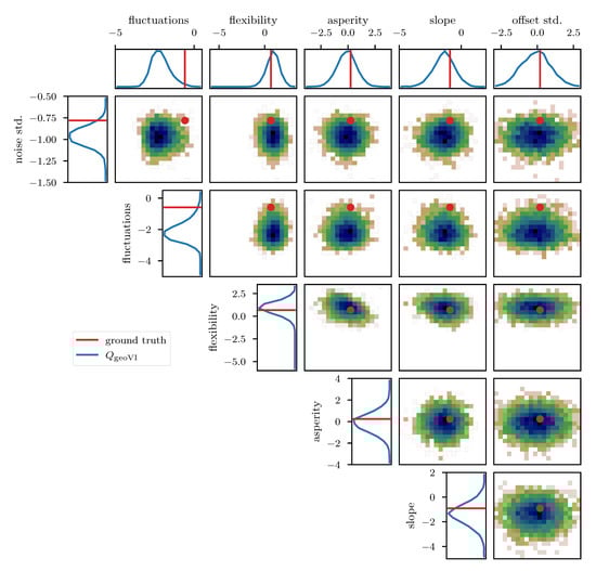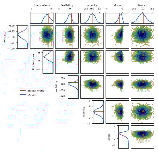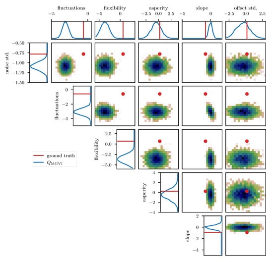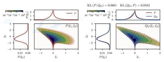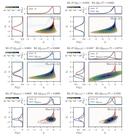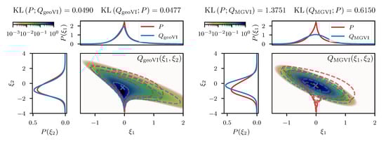 where and follow standard distributions a priori. This artificial model results in a linear prior correlation between the mean and the log-variance and thus introduces a non-linear coupling between m and v. The resulting two dimensional posterior distribution can be seen in the left panel of Figure 3, together with the two marginals and for a given measurement . We approximate this posterior distribution following the direct approach described in Section 3.1, where the expansion point is obtained from minimizing the sum of the posterior Hamiltonian and the log-determinant of the metric (see Equation (43)). The resulting approximative distribution is shown in the right panel of Figure 3, where the location of is indicated as a blue cross. In comparison to the true distribution, we see that both, the joint distribution as well as the marginals are in a good agreement qualitatively, which is also supported quantitatively by a small difference of the KL between P and (see Figure 3). The difference between P and appears to increase in regions further away from the expansion point, which is to be expected due to the local nature of the approximation. However, non-linear features such as the sharp peak at the “bottom” of P (Figure 3), are also present in , although slightly less prominent. This demonstrates that relevant non-linear structure can, to some degree, be captured by the coordinate transformation g derived from the metric of the posterior.