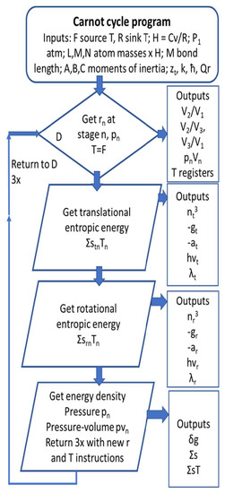 An alternative but consistent approach to the classical treatment of the Carnot cycle involves the calculation of entropy using the quantum property of action [4]. According to Kennedy et al. [7], the entropy (S) is naturally partitioned as translational (@t), rotational (@r), and vibrational forms (@v) forms of relative motion as action. This approach allows easier calculation of the entropy of ideal gases and the Gibbs energy, as shown in Section 5 and Section 6. To obtain the total entropic heat energy required to reversibly bring a gas from absolute zero (where the entropy is zero) to the current temperature, it is sufficient to multiply each of these partitioned entropies by the temperature T and then to take their sum (ST). This includes the heat required for all isothermal phase changes such as melting and vaporizing as well as for other forms of disaggregation. For simplicity of expression, each partition for entropy contains within the logarithm an exponential term that accounts for enthalpy (e.g., e3/2, e5/2) depending on the complexity and degrees of kinetic freedom of the molecule. A relative action ratio (e.g., @t/ħ = nt) is also included, indicating the mean quantum state or molecular configuration. The logarithm of this term accounts for latent heat in ST or negative Gibbs energy that varies with volume and temperature.