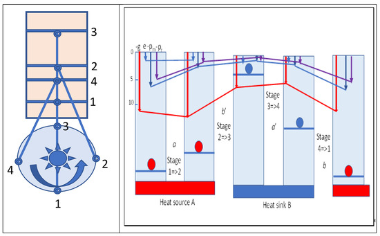The heat added or extracted in the isothermal stages in the cycle can be considered as changing the density of field quanta supporting the molecular field in expansion or compression. Since the internal and kinetic energy in these isothermal stages is constant, it has no overall role in the work performed. Action mechanics suggests that this irrelevance for internal energy may also be true of the two adiabatic stages, although the variation in the Gibbs energy in adiabatic stage 2=>3 (b′) of dilatation is greater than that in stage 4=>1 (b), the difference also being equal to the maximum work performed. This is a result of the higher quantum number for the former process and the reduced quantum number in stage 4=>1 after heat is lost isothermally in stage 3=>4. Obviously, the molecular kinetic energy dictates the momentum and pressure on the piston, but this would not be possible without the intensity of the quanta exerting the primary pressure on molecules with impulses at the speed of light. This is a basic statement of action resonance theory [4]. Figure 4 summarizes various variables and their changes in Carnot cycles. A flywheel is indicated that would be required to provide reversibility in the cycle. From maximum compression in stage 1, heat flows spontaneously from the hot source as marginal cooling occurs in expansion of the cylinder, as driven by the flywheel. Once the hot source is removed, adiabatic expansion doing external work continues, cooling the working fluid. The increased volume compensates for the decreased temperature with no change in action and entropy, but with a fall in Gibbs energy, which is shown as the red line in Figure 4. Reversing these stages by reversing the flywheel would absorb heat at a low temperature from body B, compressing the volume to reach the temperature of the hot source and slightly exceeding it. Then, heat is released to the hot source body A, acting as a heat pump from cold B to hot A.