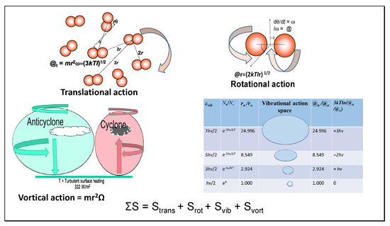 This more holistic expression is composed of thermal (3.5k) and statistical or configurational elements for translational action (@t = mrv = mr2ω = Iω) and rotational action (@r = Iω). The symbol @t represents the relative translational action, which is a functional property of molecular momentum and radial separation equal to [(3kTIt)1/2/zt1/3] [7]; It is a translational moment of inertia calculated for a cubic distribution of molecules, and zt (zt = 10.2297) is a factor avoiding double counting of molecules and correcting for the ratio of their mean speed and their root-mean-square velocity. The moment of inertia for translational motion (It) is equal to mr2—the molecular mass multiplied by the square of the mean radial separation of similar molecules. The one-dimensional translational action (@t) varies at each of the four stages of the Carnot cycle as pressure and temperature vary. The rotational action of two-dimensional molecules such as N2 is obtained as (2kTIr)1/2, where Ir is the moment of inertia of unvarying radius as in chemically bonded structures. Then, entropy action partitions are given in (6)–(9).