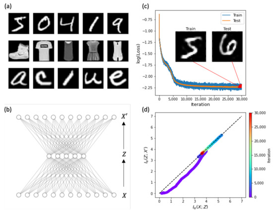 In this study, we investigated the information process of representation learning for real image datasets (Figure 1a): MNIST [33], Fashion-MNIST [34], and EMNIST [35]. MNIST has 60,000 training and 10,000 testing images of pixels of 10 hand-written digits (0–9). Fashion-MNIST has the same data size as MNIST for 10 different fashion products, such as dresses and shirts. Finally, EMNIST is an extension of MNIST; it contains 10 digits and 26 uppercase (A–Z) and lowercase letters (a–z). In this paper, we focused on the results of MNIST because the results of Fashion-MNIST and EMNIST are basically the same (refer [32]).