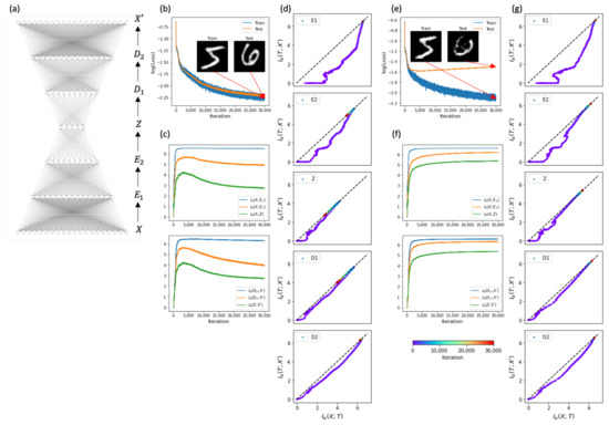 The simplifying phase and generalization of representation learning. (a) A deep autoencoder with input X; two encoders, and ; bottleneck Z; two decoders, and ; and output . (b) Learning errors for training (blue) and test (orange) data during iterations. Insets are snapshots of reconstructed training and test images of at the final iteration. (c) Changes in input mutual information (upper) and output mutual information (lower) during iterations. (d) Learning trajectories on the information plane. The general variable T stands for , or . (b–d) Experiments with the full training set of 60,000 MNIST data. (e–g) Experiments with the 10% training set of 6000 MNIST data.