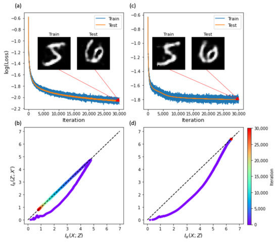 where represents the Shannon entropy of T, and and are the conditional entropies of T given X and , respectively. The forward process of the AE realizes the deterministic mapping of T = and = . Then, one-to-one correspondence of implies no uncertainty for , whereas the possibly many-to-one correspondence of implies some uncertainty for . Therefore, the inequality of is evident because , where the conditional entropy is non-negative. Based on this inequality, the learning trajectory of and on the two-dimensional IP () can be expected to stay below the diagonal line . Once the learning process of the AE is complete with , the two sets of mutual information become equal to , and the learning trajectory ends up on the diagonal line.