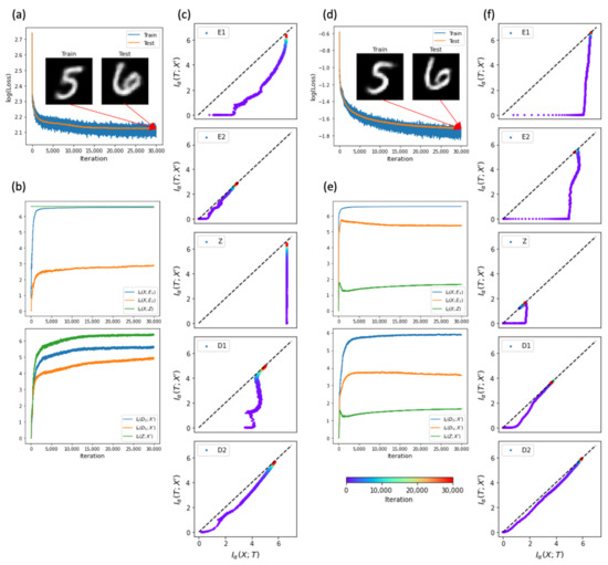 Information trajectories of generative models. (a) Learning errors for training (blue) and test (orange) data during iterations. Insets are snapshots of reconstructed training and test images of at the final iteration. (b) Changes in the input mutual information (upper) and output mutual information (lower) during iterations. (c) Learning trajectories on the information plane. (a–c) Results of a variational autoencoder (VAE). (d–f) Results of a label autoencoder (LAE). VAE and LAE had a deep network structure with . The general variable T denotes , or .