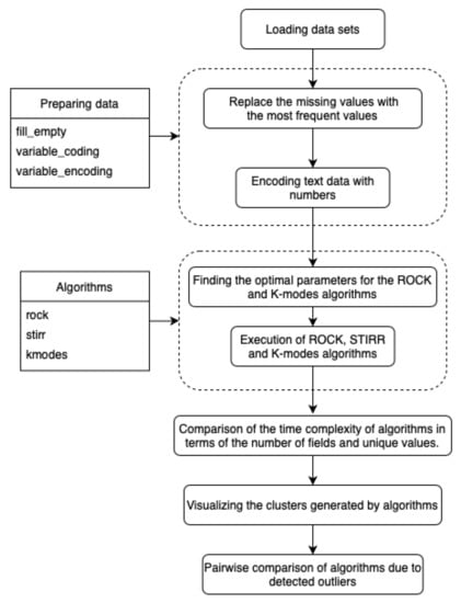 The algorithms described in Section 3 have been implemented in the language and tested on the sets described in Section 4. The environment available at the address https://jupyter.org/hub (accessed on April 2021) was used for the implementation and visualization of the data. runs in the cloud or on hardware locally and supports a preconfigured data science environment for each user. Installation of the environment requires the prior installation of on your own hardware. In this work, we have used the language version and the package containing most of the libraries enabling the execution of machine learning models and data mining and visualization of results. The existing models of the library have been used to implement the K- algorithm. due to the lack of implementation, the algorithms , were implemented by the authors. We have used the library and the structure for data visualization. Most of the computation is based on the data structures that hold the results. The diagram (Figure 1) shows the sequence of steps performed to compare the algorithms detecting outliers.