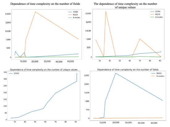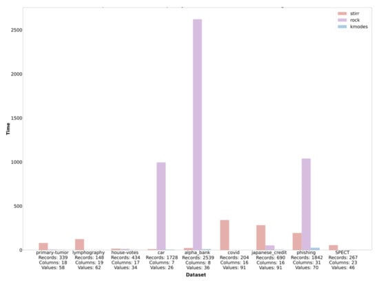 Based on the sets described in Section 4, we performed an analysis of the time complexity of the algorithms described in the work. The execution time of the algorithms is given in seconds. The study was conducted in the environment installed locally on hardware with quad-core processor and 16 GB RAM. As datasets are characterized by a different number of objects and variables and represent different types of data, the number of records, columns, and avoided values for each dataset is described on the lower axis to facilitate the analysis of time complexity (Figure 2).