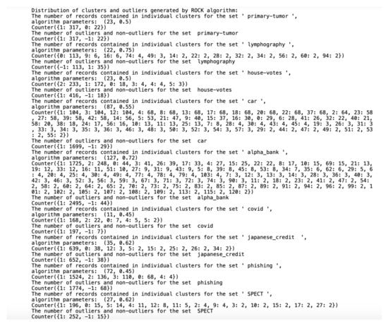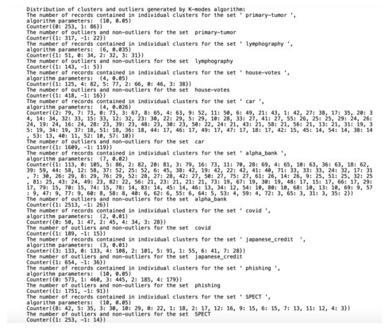 The source of the software was placed in the GitHub repository https://github.com/wlazarz/outliers (accessed on May 2021). The repository contains the implementation of three clustering algorithms for data that has only quality domains: K-, (Sieving Through Iterated Relational Reinforcement) and (Robust Clustering Algorithm for Categorical Attributes).