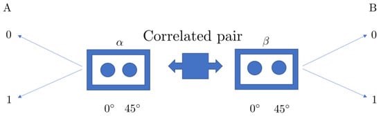 A Bell-type experiment [,,] is schematically represented in Figure 1. In each run of the experiment, a pair of entangled photons, particles, or other quantum systems is generated, with one photon traveling to the left and the other to the right. While the photons are in flight, a random selection is made on each side, selecting an angle, which sets the polarization basis to be employed in the measurement, between two previously defined options. For simplicity of notation, here, we employ the pair and on both sides. Changing the angles to, for example, and on one side has no effect on the following discussion.
