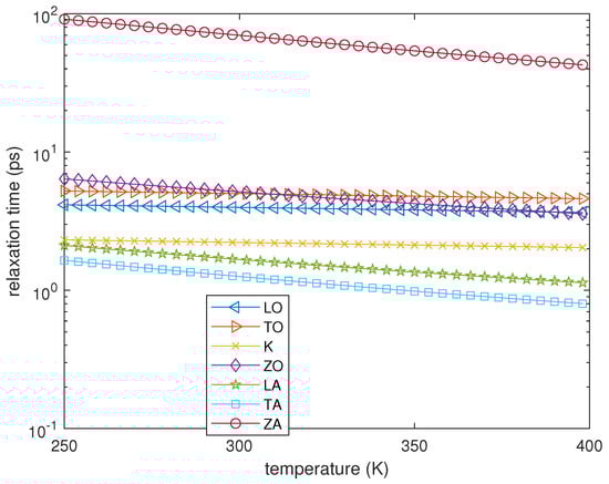 The functions , which are reported in Figure 1, are the relaxation times, each of them depending only on the temperature of the branch under consideration. The temperature is the same for each phonon population and is defined as follows.