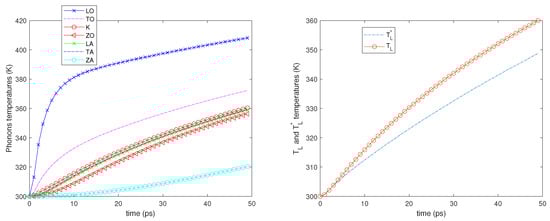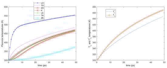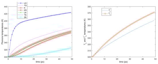 We also notice that initially, the LO, TO, and K phonon temperatures, in particular that of the LO phonons, increase more rapidly since the phonon–phonon decay acts on a longer time scale. As regards the temperatures and , see the right-hand sides of Figure 2, Figure 3, Figure 4 and Figure 5; they begin to be substantially different on a time scale comparable with that of the phonon–phonon decay and after some time, their difference remains nearly constant.