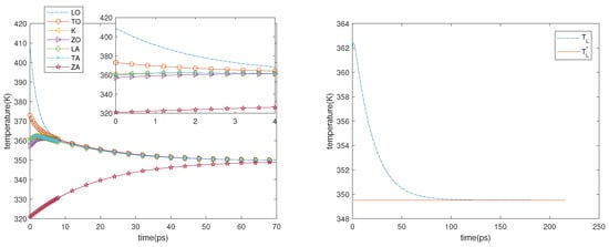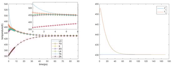 Guided by the results of the first experiment, we consider a sheet of graphene in which the initial temperatures of the phonons are the final ones of the first experiment. The electric field is turned off and only the phonon–phonon interactions are taken into account; therefore, the physical system can be described by the system of ordinary differential equations, which is obtained from (18) and (19) when no spatial dependence is present. Two cases are considered. In the first one, the initial phonon temperatures are as follows: 408.6 K, 373.0 K, 361.2 K, 357.2 K, 359.7.2 K, 360.0 K and 321.0 K. In the second one, they are as follows: 528.4 K, 468 K, 450.6 K, 444.8 K, 448.7 K, 449.2 K, and 362.4.8 K. The first thing that can be seen in the left-hand sides of Figure 6 and Figure 7 is that the ZA phonons (and, though less, also the ZO ones) have a great influence on the final temperature that is reached by the system; moreover, they have a greater inertia. The equilibrium is reached in about 60 ps and the final temperature is , which is constant during the process (see the right-hand sides of Figure 6 and Figure 7), in agreement with the energy conservation and with the fact that the right-hand sides of the evolution equations are null if, and only if, all the phonon temperatures are equal to .