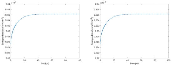 Entropy density vs. time. Left: first case of the second experiment. Right: second case of the second experiment.