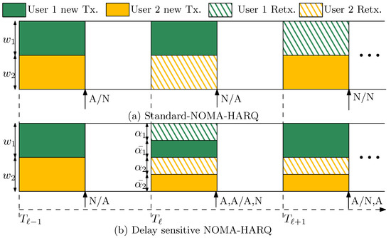 Non-orthogonal multiple access (NOMA) schemes can be used to exploit channel diversity and resource utilization by simultaneously allocating a channel to multiple users [17]. NOMA has been actively investigated in the past decade, since it can effectively provide higher throughput and flexibility in comparison to orthogonal multiple access (OMA) techniques [7,18,19]. In NOMA, multiple devices can share the same radio resources using the superposition of signals. Successive interference cancellation (SIC) is used to separate the signal of each user at the receiver [20]. NOMA can be implemented by either power or code sharing between users [21]. NOMA is mainly analyzed in the asymptotic blocklength regime and, more recently, in the finite blocklength regime, proving that NOMA effectively provides better resource utilization and energy efficiency [22,23,24]. In [22,25], the authors show that NOMA outperforms OMA and reduces the latency under a finite blocklength regime. In NOMA, more users can be served over limited channel resources, resulting in higher spectral efficiency, which reduces latency as well [22]. These features of NOMA make it a potential candidate technique for URLLC and mMTC scenarios. In HARQ, in case of packet failure, the receiver feedbacks a negative acknowledgment (NACK) and requests for retransmission. In contrast, upon receiving an ACK, the transmitter sends a new packet. Upon a retransmission request, the transmitter can either send a duplicate copy of the packet, known as chase combining HARQ (CC-HARQ), or send more redundancy through forward error correcting code, known as incremental redundancy HARQ (IR-HARQ) [26]. The receiver combines the retransmission with failing packets to increase the decoding reliability. With CC-HARQ, maximum ratio combing (MRC) is used to increase the effective signal-to-noise ratio (SNR), whereas with IR-HARQ, code combing is used to increase reliability.