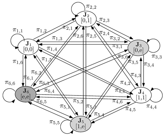 We use an MM, as shown in Figure 2, whose states are represented by a vector , where is the current state of user i. State 0 refers to a packet success without any retransmission, State 1 refers to a packet success after single retransmission, and State e refers to packet failure after single retransmission.
