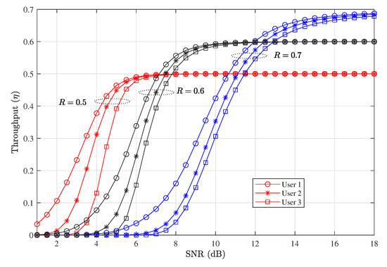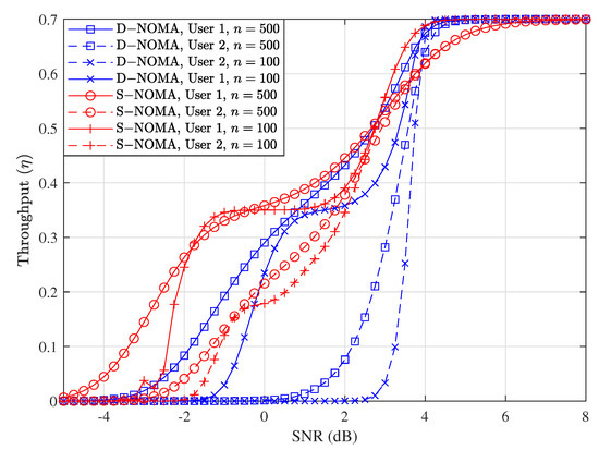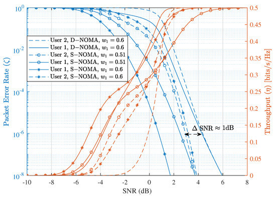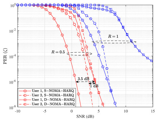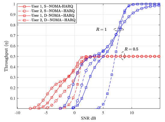 Figure 4 shows the throughput versus SNR performance comparison between S-NOMA-HARQ and the proposed D-NOMA-HARQ at two different rates, i.e., and . As can be seen in the figure, S-NOMA-HARQ achieves higher throughput than D-NOMA-HARQ, when the SNR is low. With D-NOMA-HARQ at low SNRs, SIC decoding of packets is more erroneous because of overlapping transmission and retransmission packets. Whereas, the reliability of S-NOMA-HARQ is superior to D-NOMA-HARQ because HARQ retransmissions are conducted independently to regular transmission with maximum power and separate time slot. However, as the SNR increases and the packet can be recovered using SIC more reliably, excessive retransmission of S-NOMA-HARQ results in throughput saturation. On the other hand, D-NOMA-HARQ maintains a steady gain in throughput with SNR and eventually attains the same level of throughput as achieved with S-NOMA-HARQ. Note that D-NOMA-HARQ throughput performance is better than S-NOMA-HARQ at a specific rate point and SNR region, such as and SNRs from 8 dB to 15 dB. This throughput gain of D-NOMA-HARQ over S-NOMA-HARQ can be seen in Figure 4 clearly, at SNR = 10 dB and . Because at this SNR and rate, the maximum number of retransmitted packets can be recovered using SIC with very high reliability. Finally, the throughput performance of D-NOMA-HARQ and S-NOMA-HARQ eventually becomes similar, when the SNR is very high, such that no retransmission is required and all the packets are successful with only a single transmission.