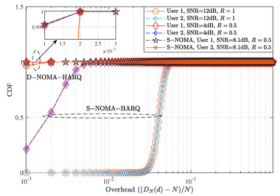 We present the delay performance comparison between proposed D-NOMA-HARQ and S-NOMA-HARQ in Figure 5. We assume that packets are scheduled to be transmitted, and each packet has a specific deadline to reach the receiver. We assume feedback, decoding, and other processing delays to be zero and only account for the retransmission delay. The overall delay of 1000 packets is normalized to 1. Therefore if all the packets are delivered by their respective deadline, the delay overhead is zero. However, if a packet is received after one unit of delay due to retransmission, it incurs a delay overhead. With a specific retransmission rate R and SNR, each scheduled user has an average PER reliability, as can be seen in Figure 3. On the contrary, packet-level delay derived in (8) is not an average delay measure and depends upon the number of scheduled packets. However, the error rate of each of N scheduled packets can be found by (5). The D-NOMA-HARQ design does not allow a packet to be delayed by more than one time slot. In contrast, each retransmission in S-NOMA-HARQ delays all the subsequent packets by one slot. Therefore the delay performance of D-NOMA-HARQ is much better than S-NOMA-HARQ. In both S-NOMA-HARQ and D-NOMA-HARQ a packet is discarded if the maximum retransmission limit is reached and the receiver is unable to decode.