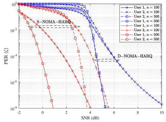 Figure 3 shows error rate performance comparison of proposed D-NOMA-HARQ and S-NOMA-HARQ with different SNRs and rates. We fix the packet length and vary and to model rate and , respectively. As shown in this figure, the PER performance of D-NOMA-HARQ is worse than S-NOMA-HARQ, and there exists an SNR performance gap. More specifically, the SNR gaps for target PER of at rate are about 6 dB and 8 dB for user 1 and 2, respectively. However, by reducing the rate to , the PER performance gap reduces to about 3 dB and 1 dB for user 1 and 2, respectively, for the target PER performance range to . This is because D-NOMA-HARQ is designed for target delay performance and uses less power and time slots by serving retransmission requests non-orthogonally with new arriving packets, whereas in S-NOMA-HARQ the retransmission is conducted with full power in the new time slot. Thus overall, D-NOMA-HARQ conducts its transmissions with efficient power and bandwidth utilization. Another cause of PER performance loss is that in D-NOMA-HARQ, non-orthogonal sharing of packets causes interference if SIC is unsuccessful. On the other hand, S-NOMA-HARQ allocates full resources, i.e., time slots, and the SNR is same for its transmissions and retransmissions. Fortunately, with a lower rate, i.e., , the non-orthogonal retransmission and new transmission can be decoded with a higher success rate using SIC; therefore, the SNR gap between D-NOMA-HARQ and S-NOMA-HARQ decreases.