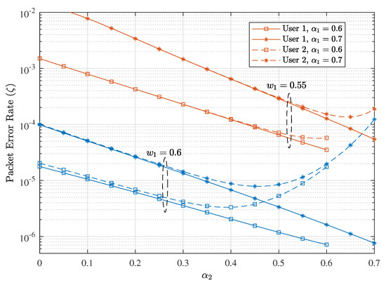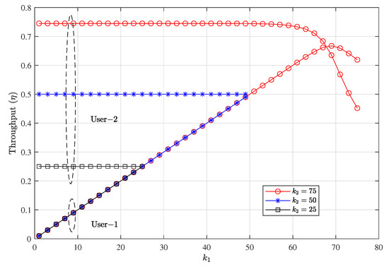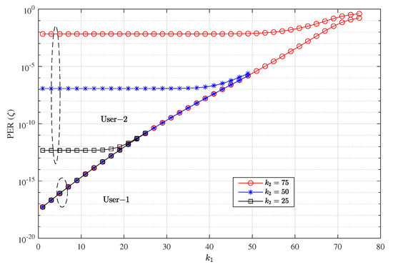 Figure 8 and Figure 9 show the PER and throughput performance of each user with various and . As can be seen in the figure, a higher value of leads to lower PER reliability. The figures show that by choosing different k for each user, different levels of reliability can be achieved. The PER is reduced with smaller values of k; however, it reduces the maximum achievable throughput as well as can be seen in Figure 9 . This is because at SNR = 4 dB and a higher rate can be chosen with an acceptable PER reliability. Also, the throughput steadily increases with ; however, setting very high decreases the PER reliability and throughput performance starts to saturate. We can see in Figure 8 that at results in severe PER degradation, and consequently, throughput performance starts to saturate for both users. Since user 1 is operating at higher transmission power than user 2 the throughput loss is higher in user 2 when is very high.