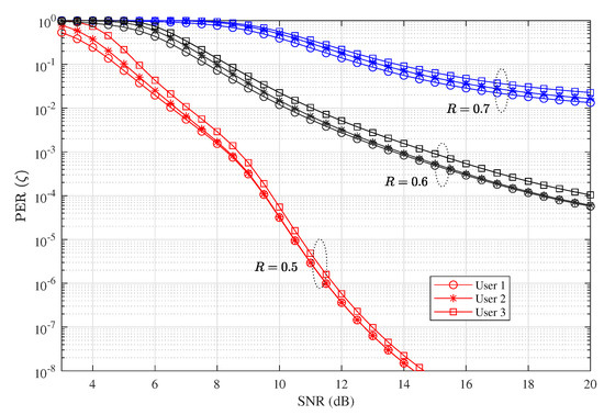 Figure 10 and Figure 11 show respectively the PER and throughput performance of D-NOMA-HARQ when . We show the performance variation with different code rates R. As can be seen in Figure 10, when the code rate is high, the PER performance is poor in low SNRs and reduces slowly in the medium and high SNRs. The corresponding throughput is also poor in low SNRs and increase gradually when . This is because when the number of users are increased, each user experiences relatively higher interference. However, by reducing the rate, i.e., and , the early saturation of PER can be avoided. This results in higher throughput in low SNRs. Therefore, with increasing the number of users with D-NOMA-HARQ, proper code rates should be chosen to achieve the target PER and throughput for all users.