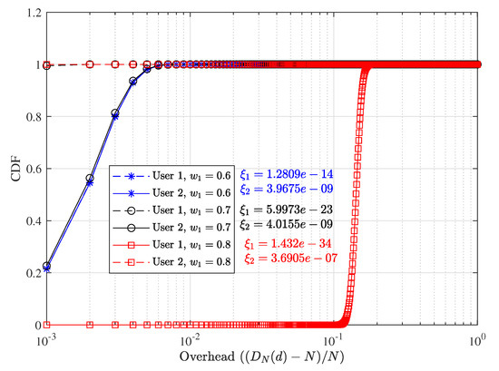 In practical systems, users adopt the transmission rate according to their respective channel quality to increase reliability. Each user can transmit at a different rate according to their respective quality of service by changing k. We set and by fixing the blocklength n and varying and for user 1 and user 2, respectively. We assume to allow user 1 with higher decoding reliability than user 2.