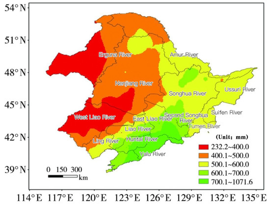 The Song-Liao River Basin includes two sub-basins, the Liao River Basin and the Songhua River Basin, whose total area is 1,248,948 km2. The basin is surrounded by mountains to the west, north and east, and there is a vast plain in the middle of the basin. The specific distribution of rivers is shown in Figure 1. In the Song-Liao River Basin, that is rich in black soil resources, the plains are flat, the soil is fertile, the rainfall is abundant, the climate is suitable, the sunlight is sufficient, and it has good conditions for agricultural development [58]. What’s more, the basin is also a major industrial hub for coal, steel, petrochemical and equipment manufacturing [59,60,61]. In terms of precipitation, the annual average precipitation in the Song-Liao River Basin shows a spatial distribution characteristic of less precipitation in the northwest and more precipitation in the southeast [2]. The spatial distribution of annual average precipitation in Song-Liao Basin is shown in Figure 1. At present, the Song-Liao River Basin is in a stage of extreme precipitation, and the probability of extreme precipitation has increased [62]. What’s more, due to uneven seasonal precipitation and the high-water level of the drainage channel, the internal water cannot be discharged. The mountainous area has serious soil erosion, and a large amount of sediment is discharged and deposited on the drainage channel, which causes that the riverbed has been silted up year by year, the channel is blocked, and the water is urgent in the flood season. Also, poor water leakage in the waterlogged area and low infiltration capacity have led to frequent occurrence of waterlogging in the watershed. As the northwestern part of the basin is in the westerly zone, when a large precipitation front and low-pressure system pass through this area, the rainfall will be significantly reduced or no precipitation. The normal annual precipitation is below 400 mm, and the water surface evaporation capacity is 1100–1200 mm, which caused many droughts [2]. With the development of industrialization and urbanization and the massive discharge of industrial wastewater and domestic sewage, the Song-Liao River Basin is facing a severe situation of aggravated pollution. According to relevant statistical data such as environmental yearbook, since 2014, the chemical oxygen demand (COD) emissions of the Song-Liao River Basin are about 830,400 tons, and the ammonia and nitrogen emissions are about 12.85 tons. Compared with the previous level, the water pollution problem still cannot be ignored. This objectively aggravates the vulnerability of water resources, so research on the vulnerability of water resources is timely.
