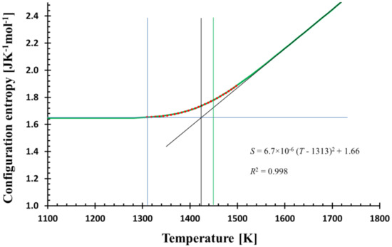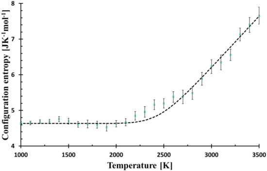 The quadratic fit perfectly matches the calculated and MD configurational entropies in the glass transition region. From a mathematical point of view, it is a consequence of the (practically) zero first derivative at and below some temperature T*, where the structure is frozen. Here, T* = 1313 K (see Figure 2). If the calculated configurational entropy is used with Adam–Gibbs [24] or MYEGA [25] relation for viscosity, no singularity is generated; T* determines only the temperature below which viscosity is practically constant.