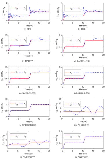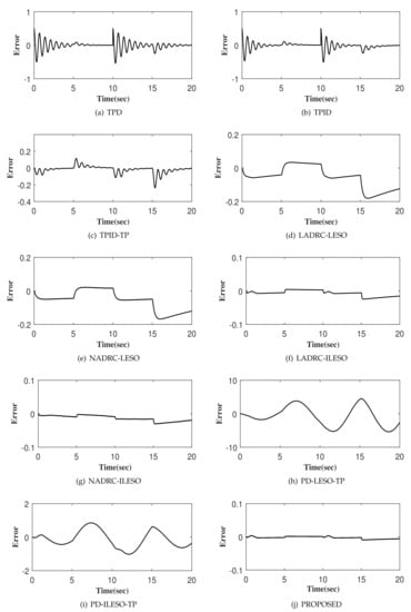 The tracking responses of ten control methods to the output of the TP, denoted as  is shown in Figure 5. Among them, Figure 5j shows the step response of  for the proposed control. Obviously, the proposed control method achieves fast tracking  without overshoot. Figure 6 and Figure 7 depict the tracking errors and control inputs of ten controllers. Moreover, four performance indexes of tracking error, including maximum absolute error (MAAE), mean absolute error (MEAE), standard deviation of absolute error (SDAE), the integral time absolute error (ITAE), as listed in Table 1. Four performance indexes of control input, including maximum absolute control input (MAACI), mean absolute control input (MEACI), standard deviation of absolute control input (SDACI), and the integral time absolute control input (ITACI) are also employed to fully analyze the control performances, as listed in Table 2. Comparative experiment results show that the proposed control method achieves the smallest tracking error with the smallest control input, which verifies its effectiveness and superiority. Specifically, by comparing with nine control methods, the following conclusions are obtained: (1) The control method can improve the control performance with the assistance of TP strategy, which verifies the effectiveness and rationality of TP. (2) The control method can significantly improve the control performance with the aid of the ILESO strategy with small gains, which verifies the effectiveness and rationality of ILESO. (3) The control method with optimal control parameters has better control performance, which verifies the effectiveness and rationality of the parameter optimization strategy. Furthermore, the performance of the controllers PD-ILESO-TP and PD-LESO-TP with parameters set according to the traditional control method is extremely poor, and the proposed parameter optimization strategy can find the optimal parameters for the controller to achieve better control performance. For non-linear control methods NADRC-LESO and NADRC-ILESO, because their control laws show the non-smooth characteristics, high-frequency chattering occurs in the control input, which is not conducive to engineering applications. The proposed method is a litter more complicated than TPD, TPID and TPID-TP, but the control performance is superior to them. The proposed control method is not only simpler than LADRC-LESO, NADRC-LESO, LADRC-ILESO, and NADRC-ILESO, but also has superior control performance. The control method proposed in this paper not only obtains the best control performance, but also is suitable for high-oeder systems, and is a practical control method with strong competitiveness.