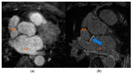 Axial view of different MRI sequences. (a) bSSFP and (b) LGE-MRI. The blue arrow points to the enhanced brightness of infarcted regions obtained in LGE-MRI. Atrial cavities are labelled as LA (left atrium) and RA (right atrium).