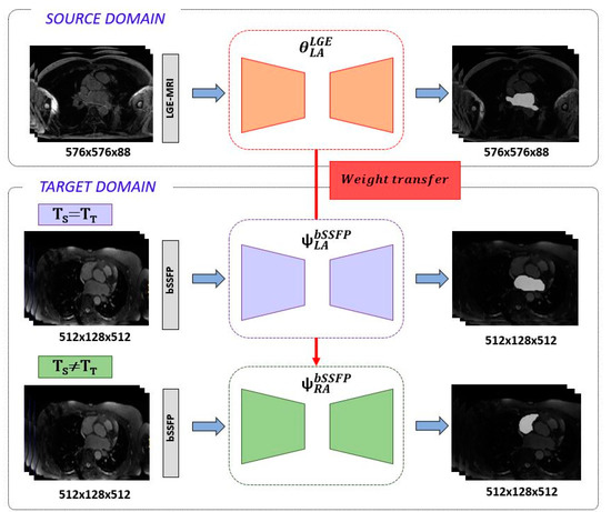 Inspired by the domain adaptation paradigm, we can define two target models, each responsible of solving different associated learning tasks (TT), under DT ≡ DbSSFP = {ST, P(XT)} image domain and a small label space YT with both RA and LA segmentation masks available. One model is tasked with LA segmentation (ψbSSFPLA) and the other with RA segmentation (ψbSSFPRA). The idea is to transfer the learned weights from θLGELA to improve the predictive function of θbSSFPLA and θbSSFPRA making use of the {xTi, yTi}Mi=1 set of samples, where M ≪ N. Note that in the first case we have defined an SDA scenario in which DS≠DT and TS = TT, whilst in the second, DS ≠ DT and TS ≠ TT.