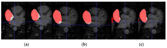 Figure 5 shows the axial view of predictions obtained for three representative patients (and slices) of the testing cohort from Database 3 with the different trained models for LA segmentation.