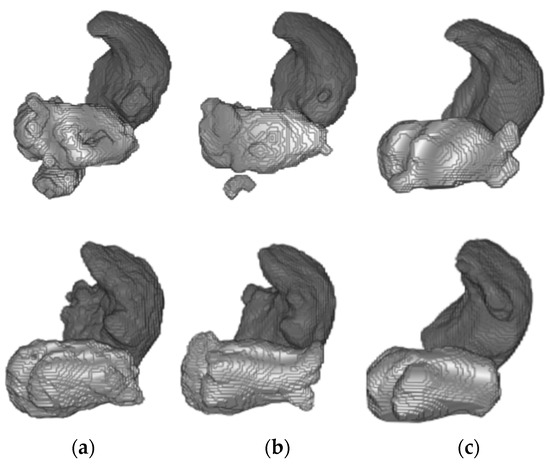 From top to bottom, 3D reconstruction of LA (light gray) and RA (dark gray) segmentations for two representative patients of Database 3 through the models (a) w/o SDA, (b) SDA and (c) ground-truth.