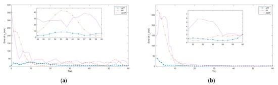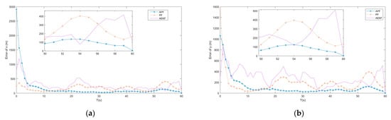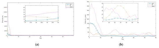(a) Error of by APF, AEKF and PF; (b) Error of by APF, AEKF and PF.