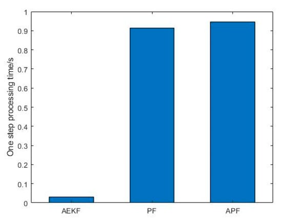 The computational complexity of the APF, AEKF, and traditional PF are shown in Figure 8 by representing their one-step processing time. It can be found that the APF and PF have similar one-step processing times since the PF process has the most computational complexity. Although AEKF is easy to operate and has the least computational load, its off-line Jacobian matrix calculation efforts and low tracking accuracy under high nonlinear environments make it the least favorable one to use in our situation.